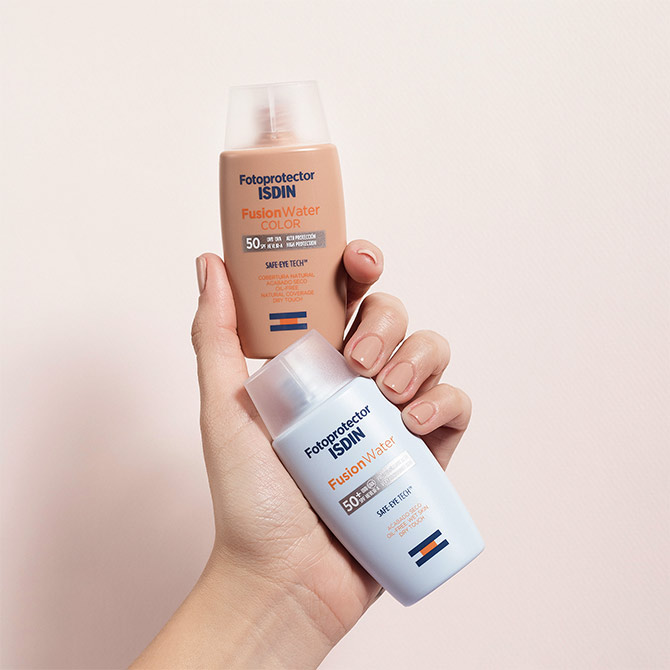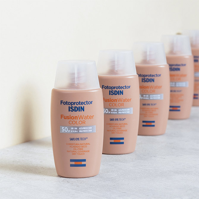 El nuevo Fotoprotector ISDIN Fusion Water Color proporciona una alta protección SPF50 y es el primer fotoprotector facial de base acuosa que aporta color y que, además, no pica en los ojos gracias a su tecnología Safe-Eye TechTM. Su textura ultraligera se absorbe de manera inmediata y hace que sea un producto perfecto para su uso diario.